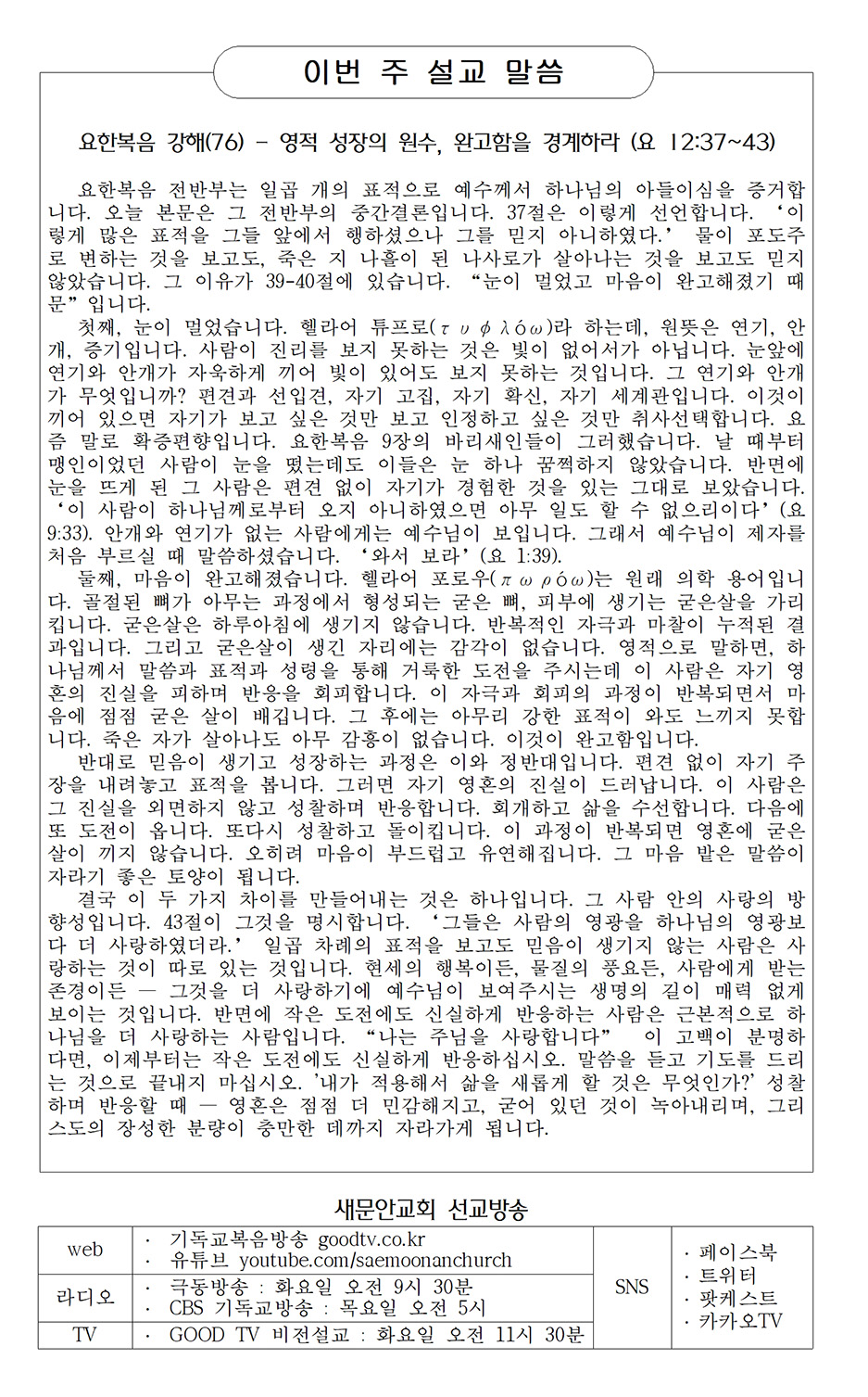 모이기를 힘써, 생명이 충만한 교회가 되게 하소서!