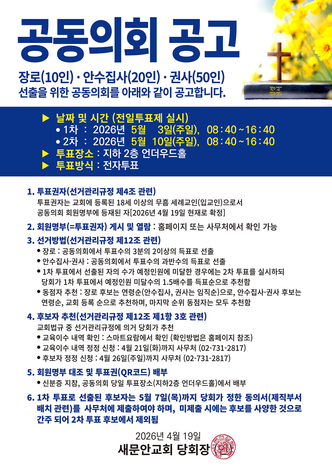 2026년 장로 장로10인, 안수집사20인, 권사50인...