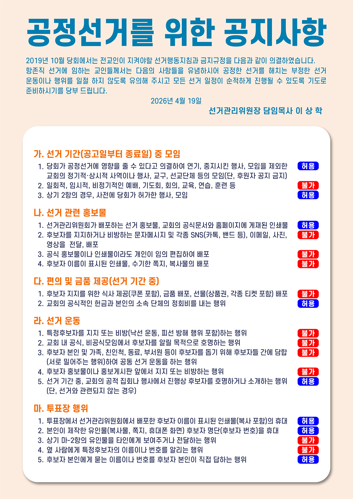 2026년 장로 장로10인, 안수집사20인, 권사50인...