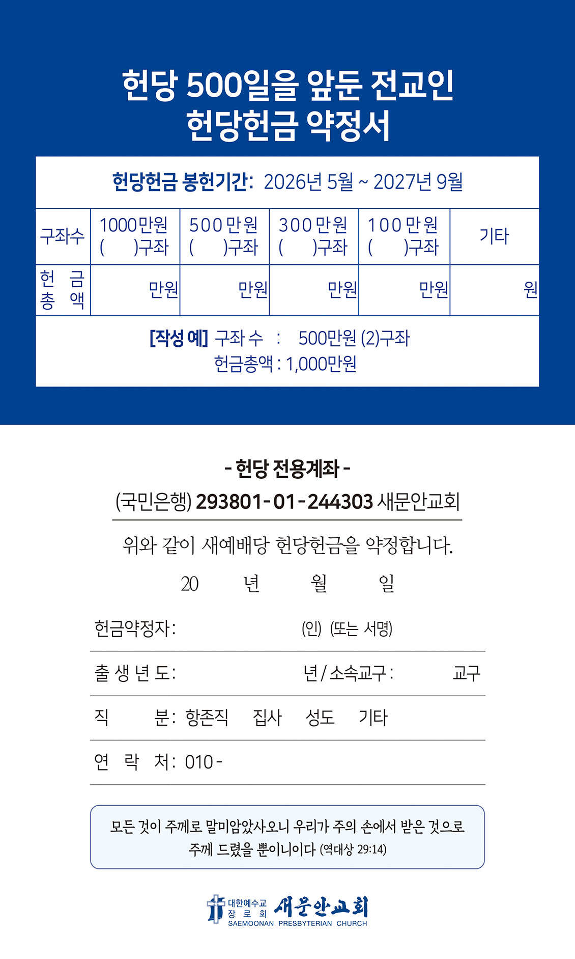 헌당 500일을 앞둔 전교인 헌당헌금 약정