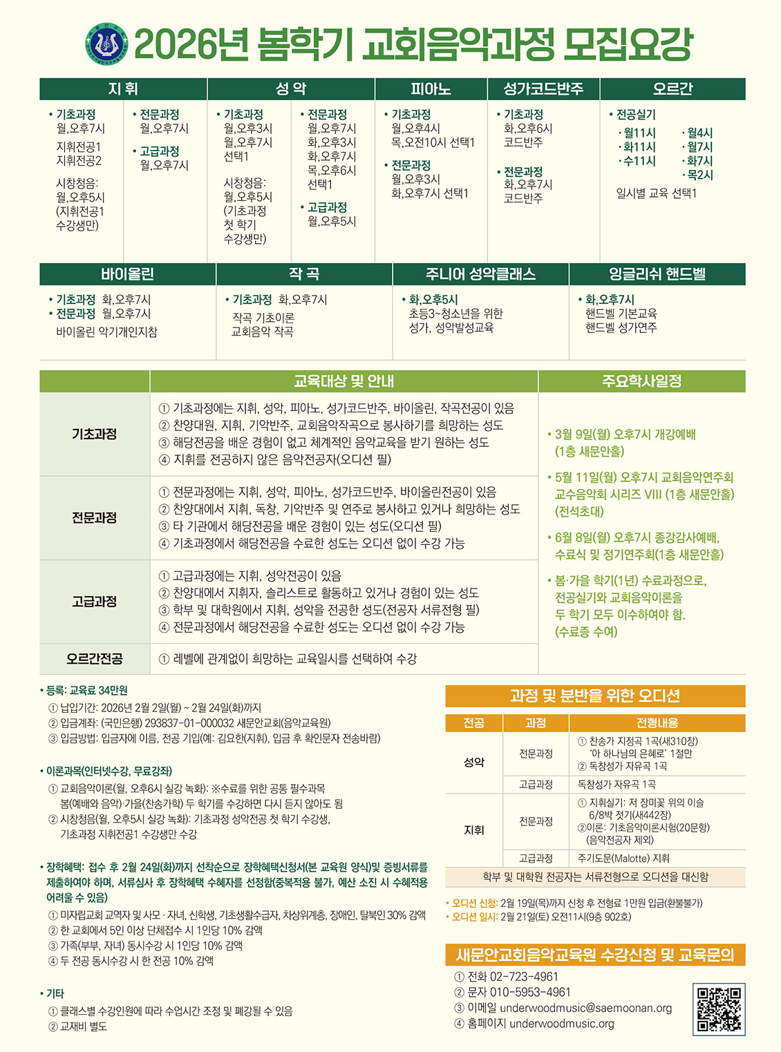 새문안교회음악교육원 수강생 모집(2026년 봄학기)