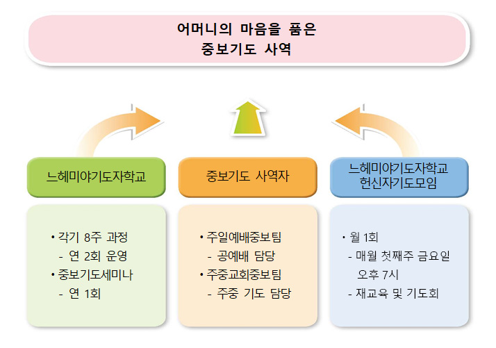 가. 중보기도를 통해 교회의 모든 사역자 및 제직들의 사역을 돕고, 이를 통해 기도의 중요성을 인식하게 하여 지속적으로 기도하는 데 앞장설 수 있도록 한다. 나. 새문안교회 교인을 대상으로 느헤미야기도자학교를 운영하여, 중보기도에 대해 체계적으로 배울 수 있는 기회를 제공한다. 다. 중보기도 사역의 현장을 통해 실질적인 기도 사역자로 세워 교회를 섬기는 일에 헌신케 한다. 라. 교회와 하나님 나라에 관련된 모든 사역을 위한 영적 힘이 되도록 기도로 돕는다.