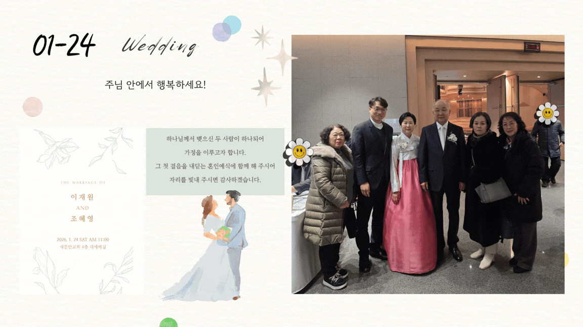 1/23(금) 권찰영성수련회 1/24(토) 지도위원 영성수련회 4/18(토) 교구영성수련회 4/21(화) 6교구 주관 화요가족기도회 7/12(일) 교구헌신예배 10/20(화) 6교구 주관 화요가족기도회 11/14(토) 연합구역예배